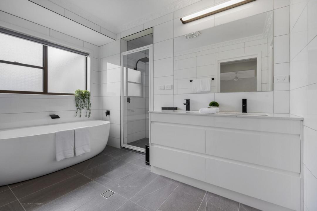 Dual ensuite / upstairs bathroom has a lovely deep bath tub shower and separate toilet